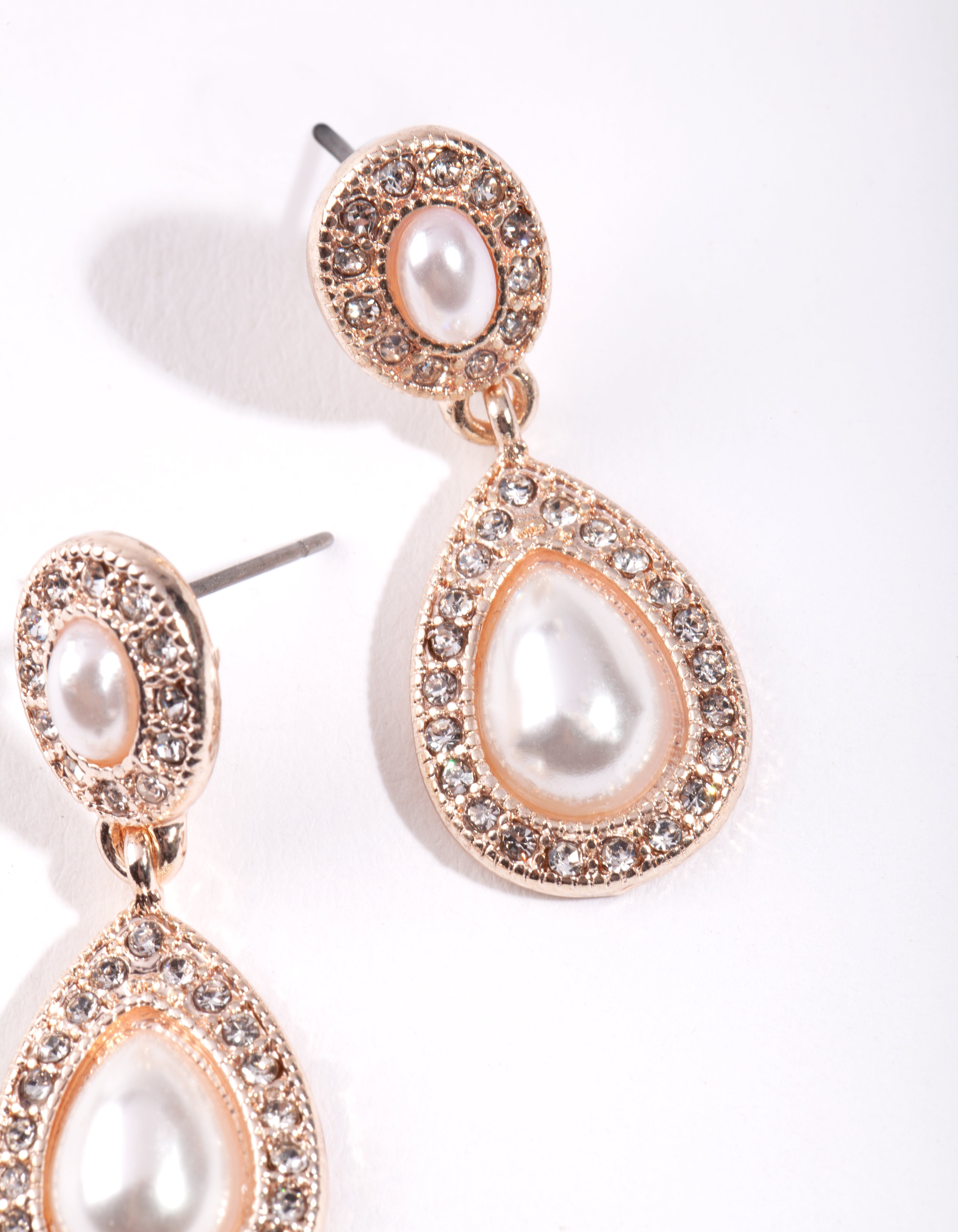 Rose Gold Mini Diamante & Pearl Double Teardrop Earrings