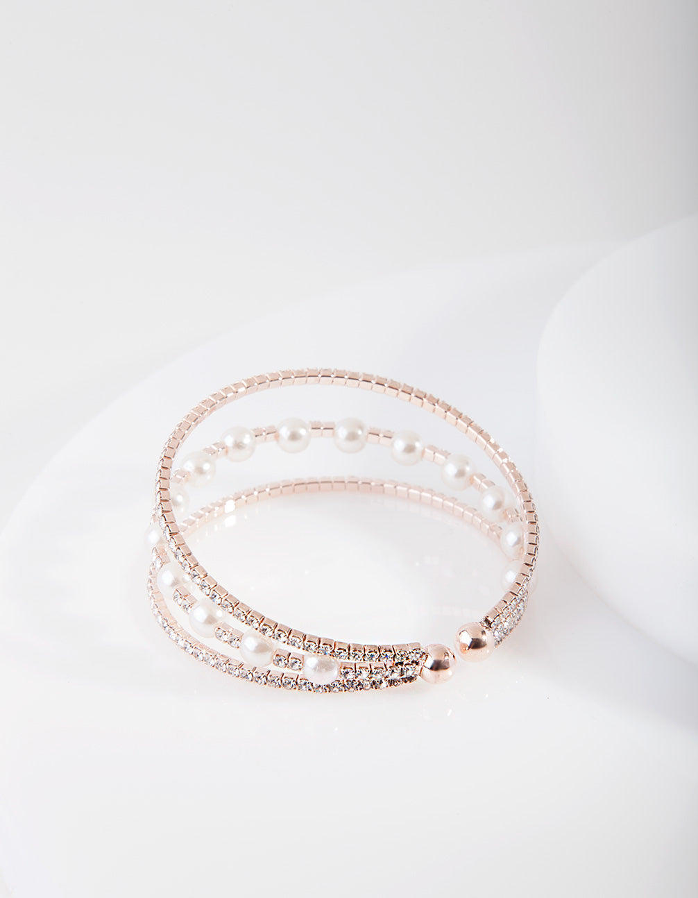 Cuffs can be worn so many ways. On the wrist as a classic bracelet/bangle or higher on the arm for a high fashion look. This bracelet features three rows of diamantes and pearls in a rose gold-tone setting.
