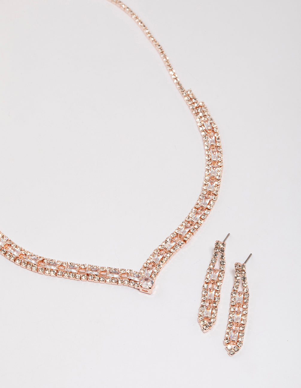 Rose Gold Rectangle Graduating Pendant Necklace & Earrings Set