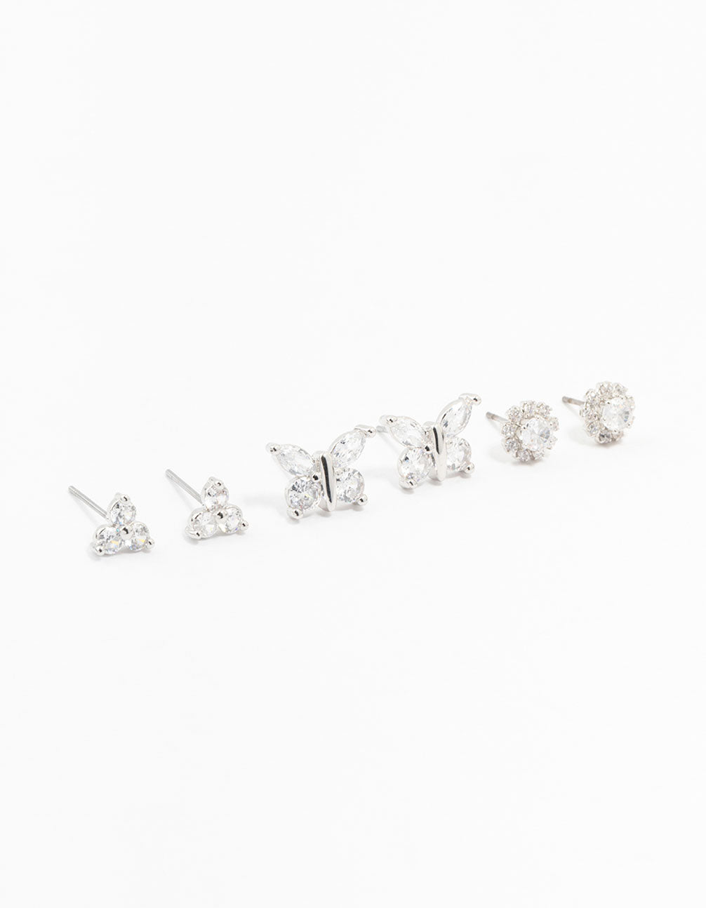 Silver Cubic Zirconia Butterfly Stud Earrings 3-Pack