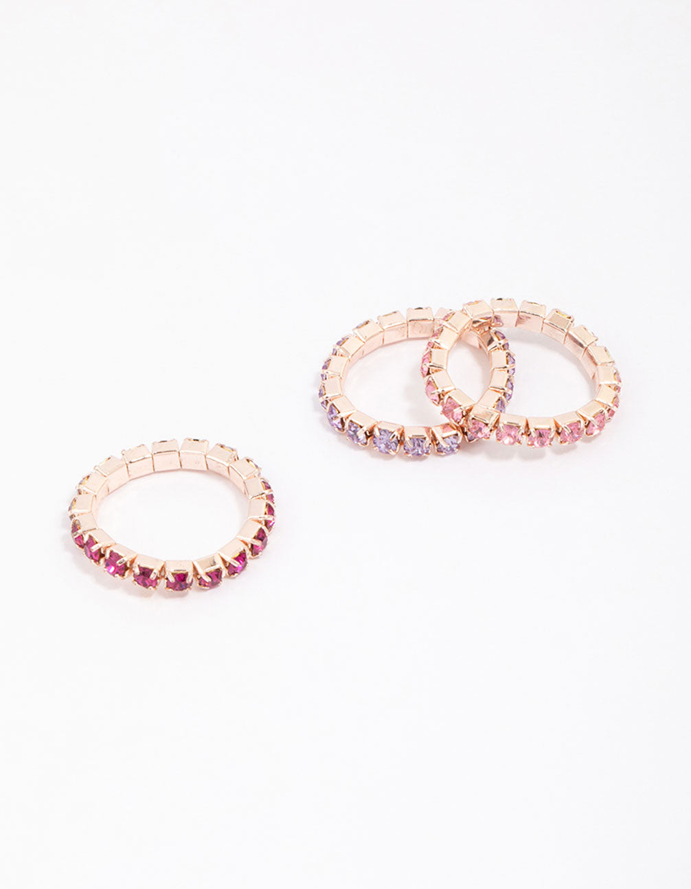 For a bejeweled touch to your stack, style this dainty ring pack. This set includes three individual stacking rings, each adorned with pink and purple crystals for a pop of colour.