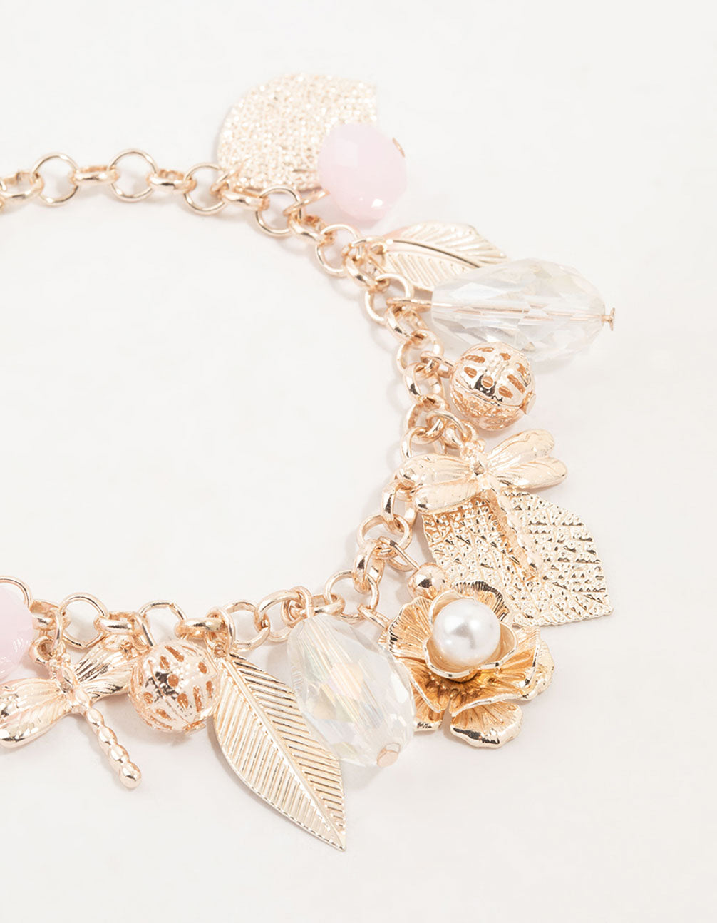 Rose Gold Dragonfly & Flower Charm Bracelet