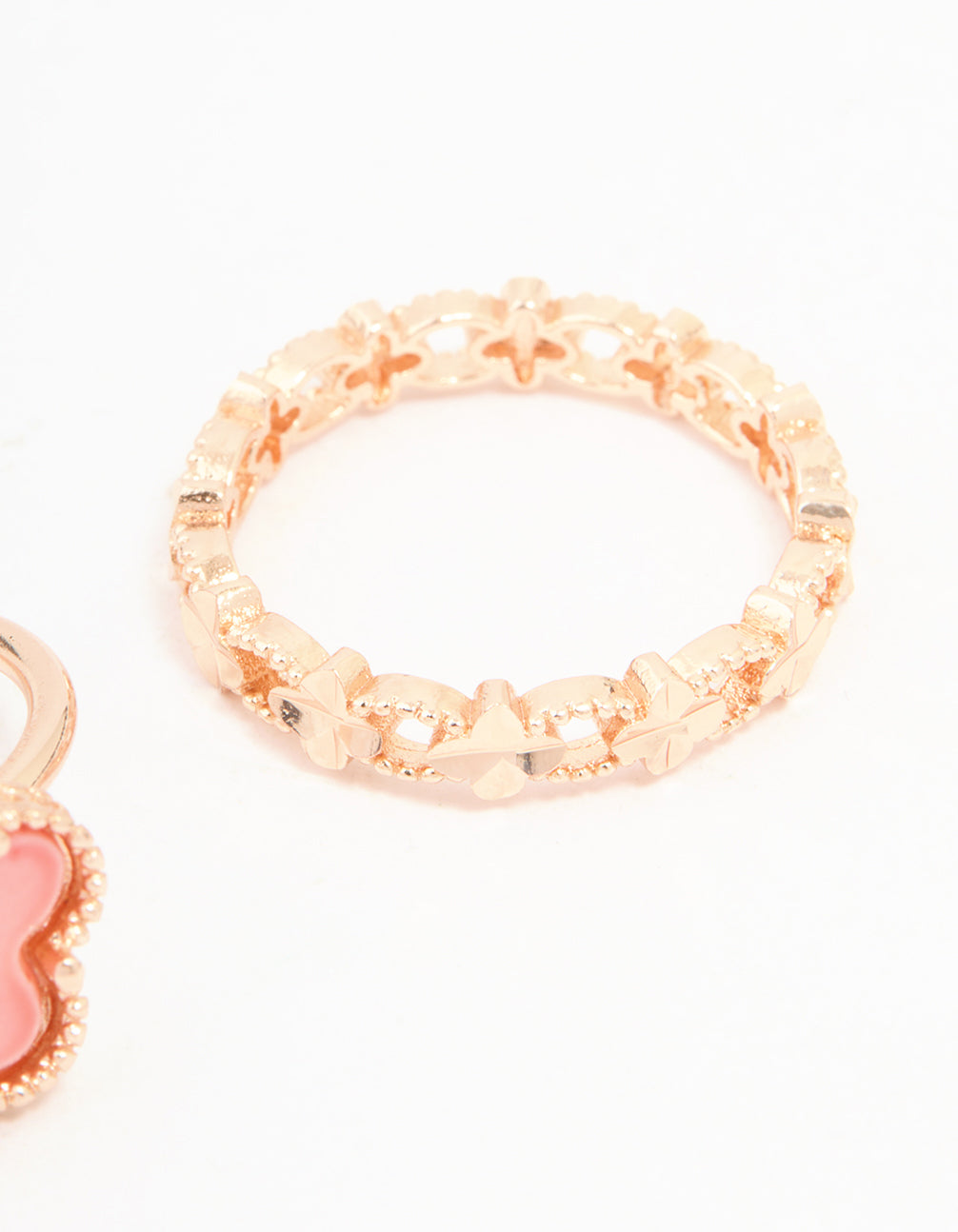 Add a touch of floral charm to your jewellery collection with this Rose Gold Flower Petal Rings Pack. Featuring one ring with a soft pink flower centre and another with delicate cut-out flower designs, this stacking ring set is perfect for creating a layered look or wearing solo for understated elegance. Crafted with a rose gold finish, these rings are ideal for adding a warm, feminine vibe to any outfit. Whether you're dressing up for brunch, a garden party, or simply want to brighten up your everyday look, these floral rings are versatile enough for any occasion. Pair them with a flowy dress or casual chic attire to complete your style. Perfect for flower lovers and fans of dainty jewellery, this set is a must-have accessory!