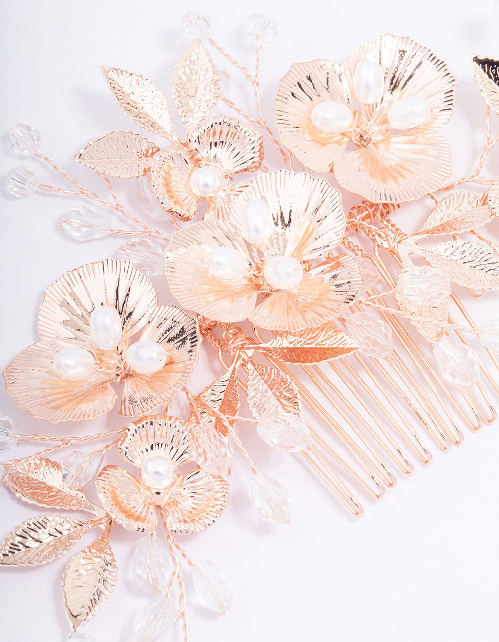 Add a decorative touch to your hairstyle with this gorgeous, rose gold hair comb. This dainty hair clip features a collection of floral motifs, adorned with delicate pearls. Perfect for up-do's and half-up hairstyles.