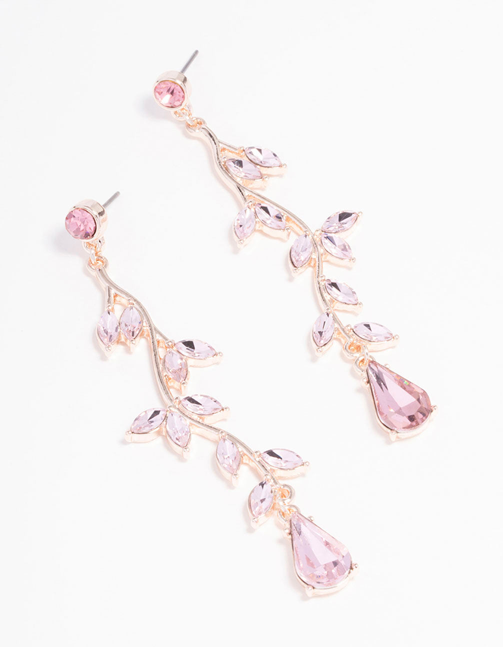 Rose Gold Pink Diamante Leaf Drop Earrings