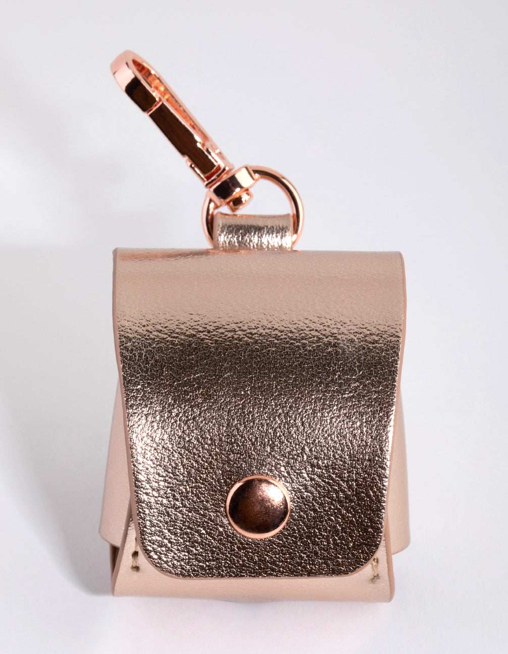 Keep your earpods safe in this cute case! It's made of durable PU leather, and boasts a pretty rose-gold colour with a button closure and keyring attachment. This case is compatible with AirPods.