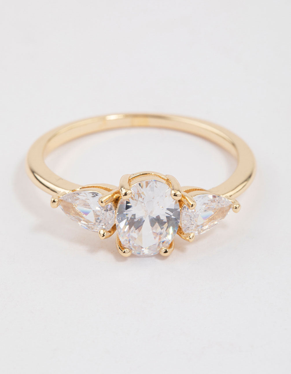 - This enchanting ring features a stunning, gold-plated setting and a trio of oval crystals for an engagement-inspired look.