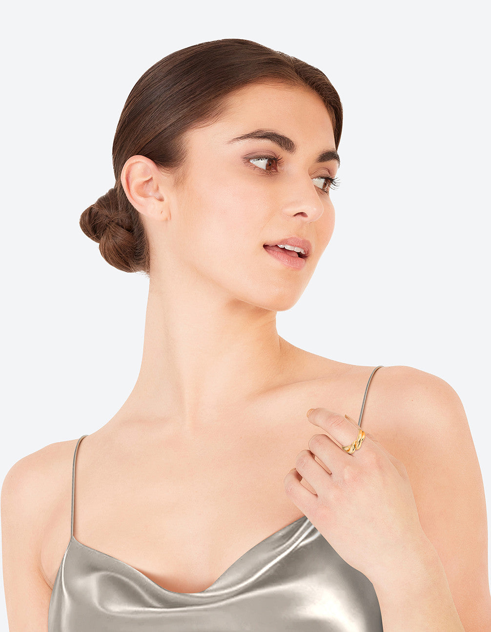 • This gold-plated ring features a unique twisted band, perfect for styling in a signature stack for a modern feel.