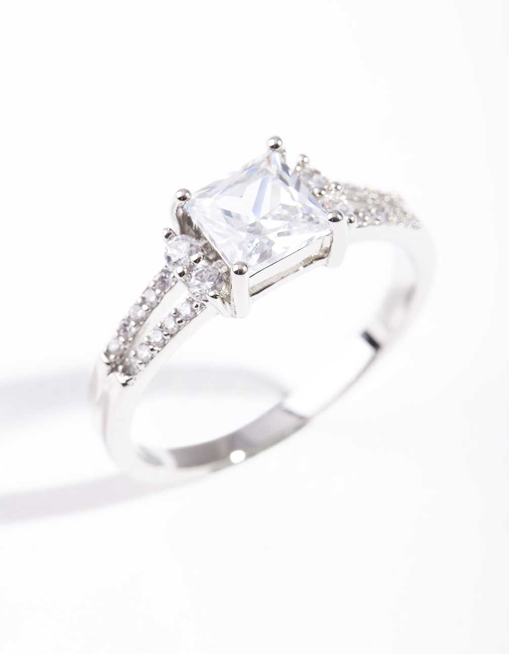 A square shaped cubic zirconia stone sits atop this silver toned ring.