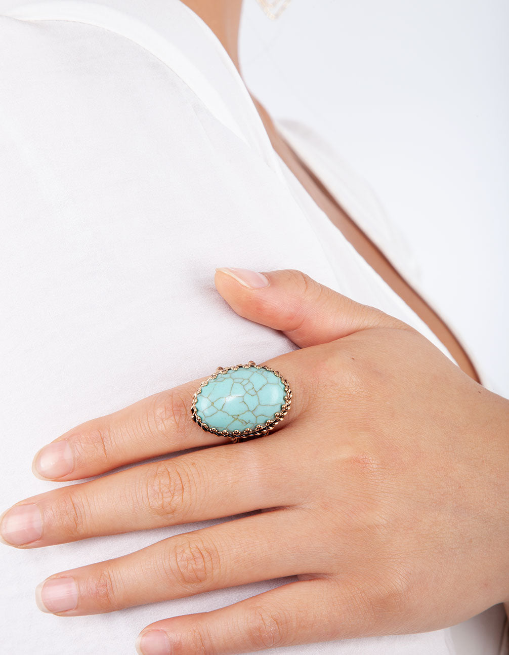 This gold toned turquoise stone ring has a vintage design that takes inspiration from the 1970's.