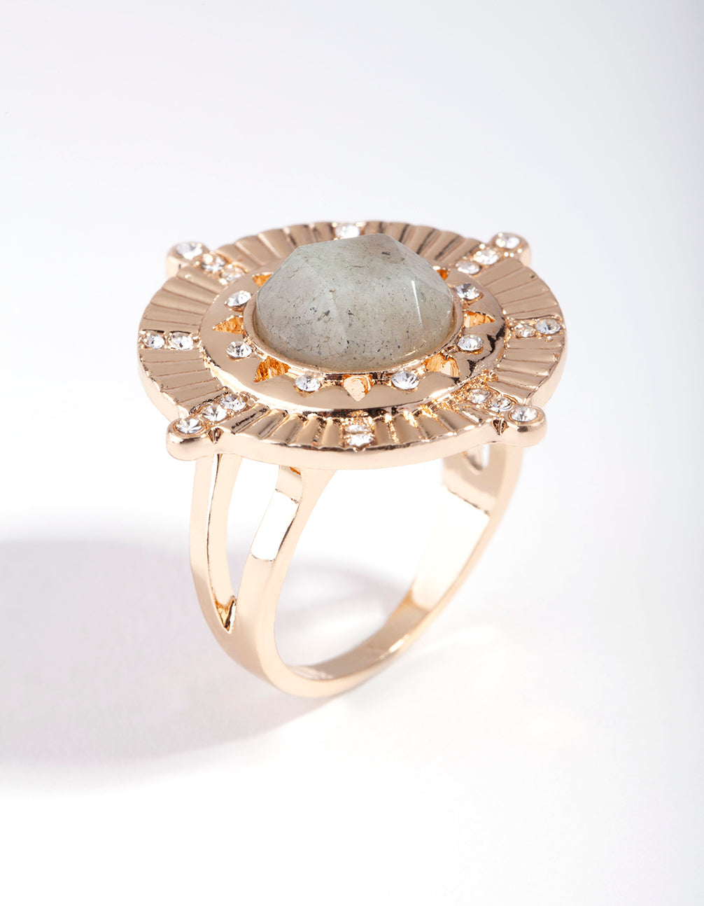 Add a pop of colour to your outfit with this gorgeous gold-toned vintage-style ring. It features a large medallion design with a green-hued stone at its centre. Wear it with other vintage-inspired pieces for a timeless look.