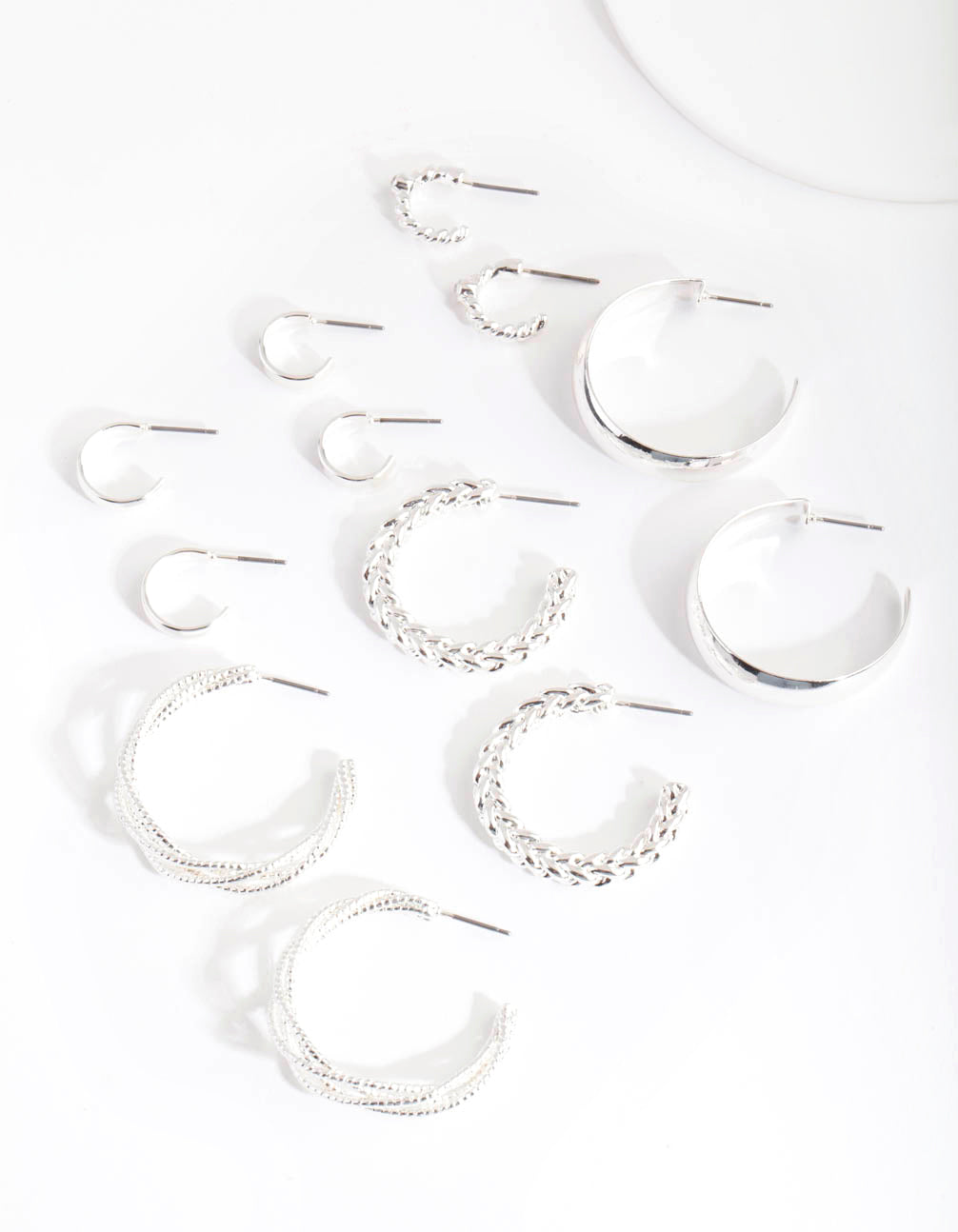 Not every occasion calls for a larger-than-life accessory and layering smaller styles means focusing on the finer details. This earring pack features a variety of twist hoop designs in a silver tone.