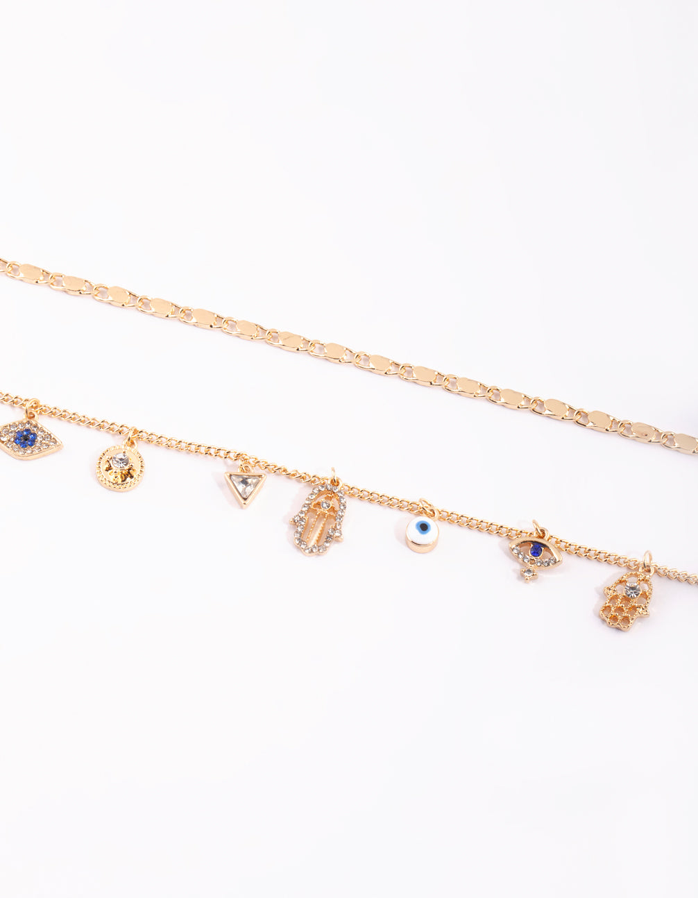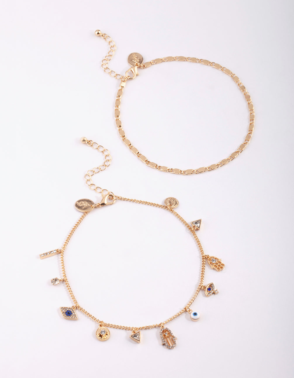 Gold Evil Eye,Hamsa & Chain Charm Anklet Pack