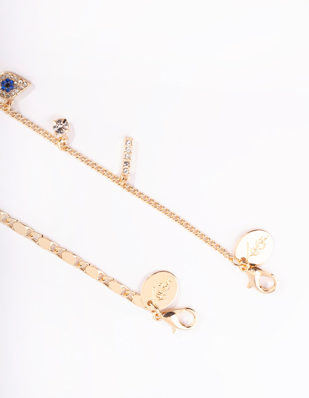 Add a finishing touch to your look with a funky anklet pack! This set includes two gold-toned anklets with evil eye, hamsa hands and diamante embellishments. Pair with your favourite gold-toned jewellery for maximum impact.