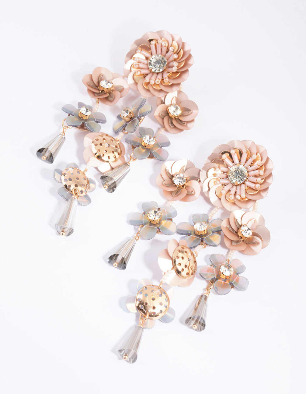 Embrace Parisian chic with Lovisa Couture Collection. These stunning statement earrings feature a dramatic drop design with blush and violet sequined flowers and diamante details.