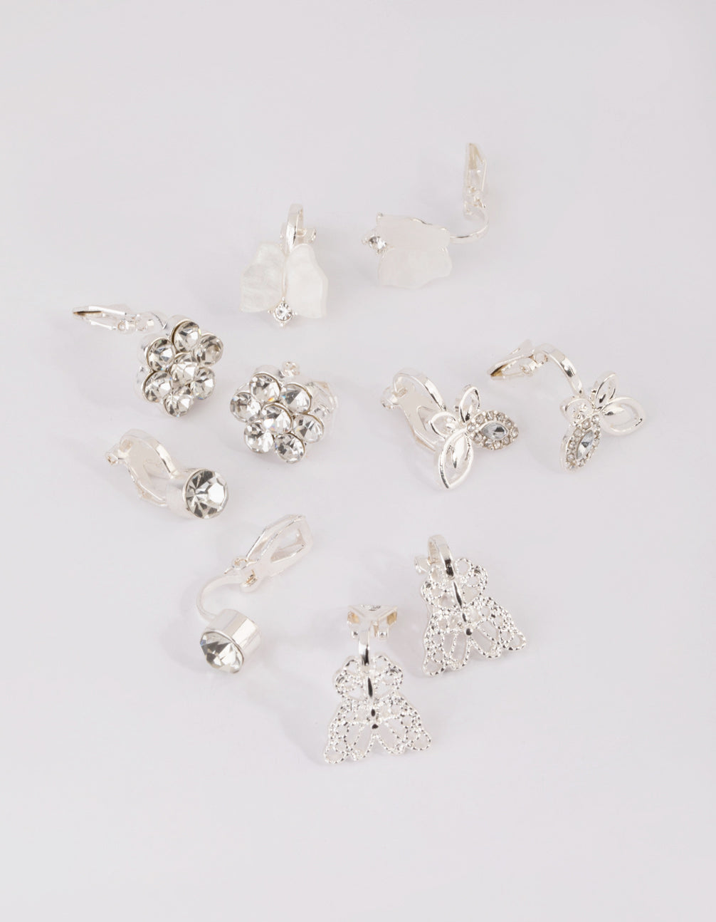 Get the look without the commitment with this cute earring pack! They look like studs, but are really clip-on earrings. This pack includes five pieces with butterfly, flower and faux crystal designs.