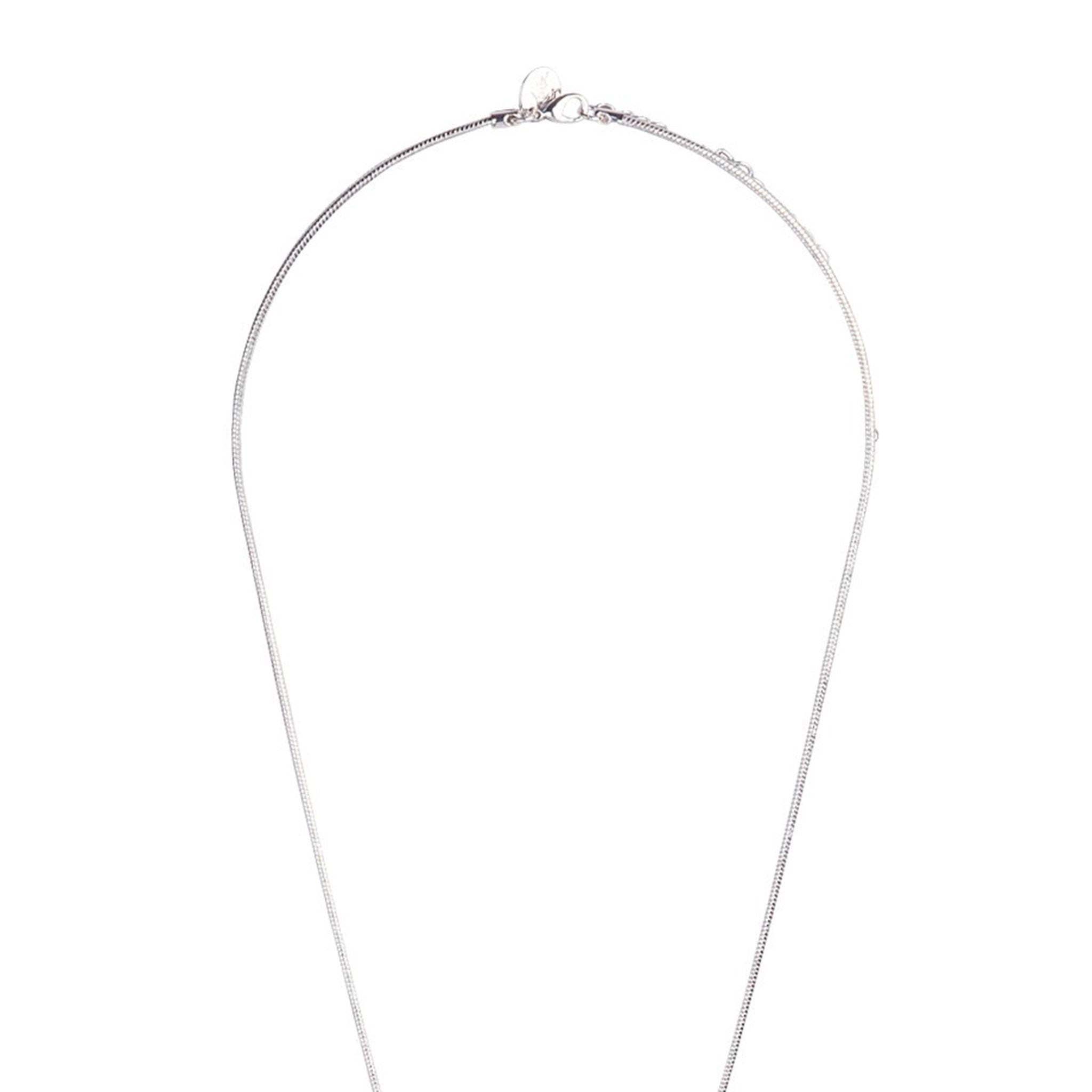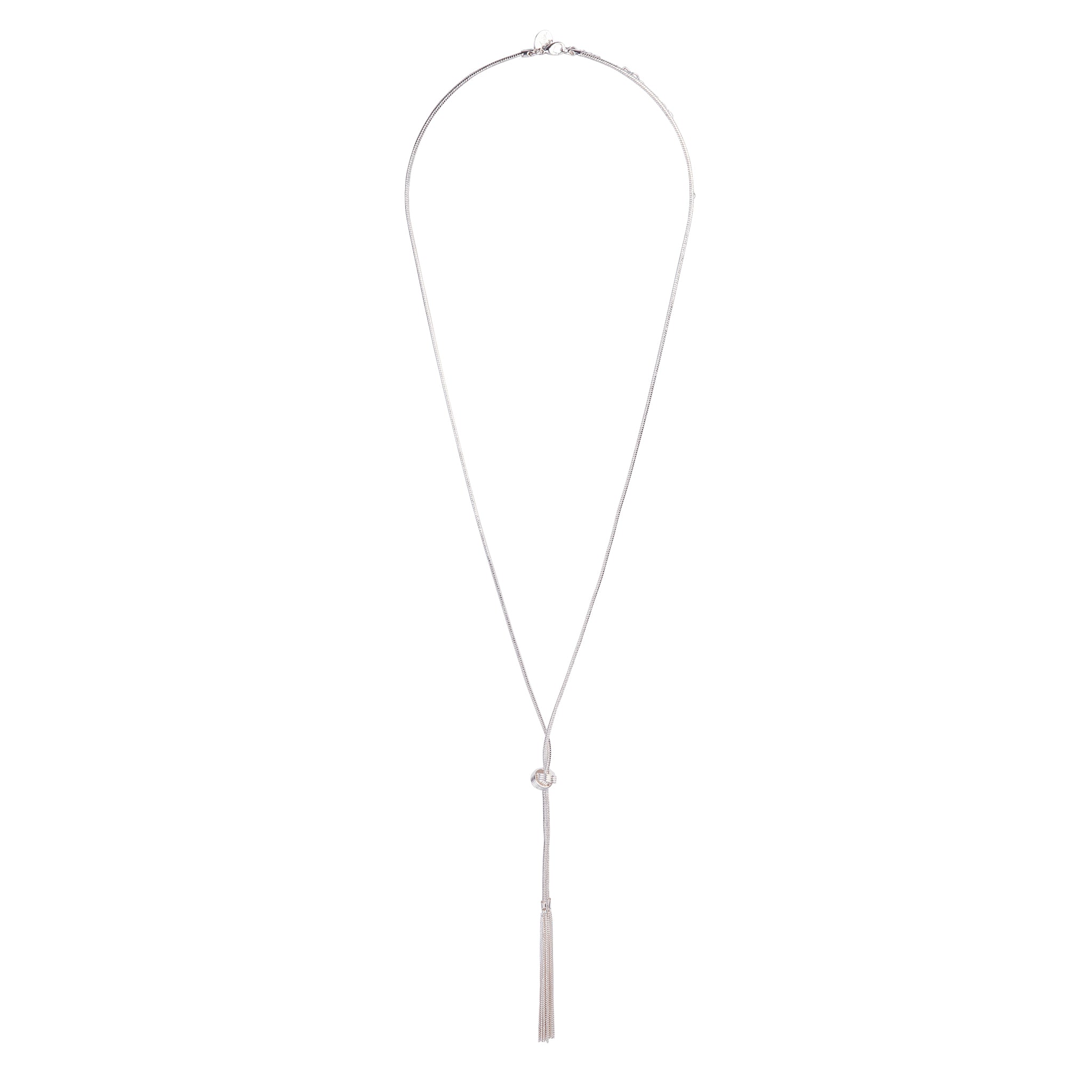Elevate your everyday style with this metal silver tone lariat necklace. Featuring a slinky snake chain, fixed metal knot and two chain tassels.