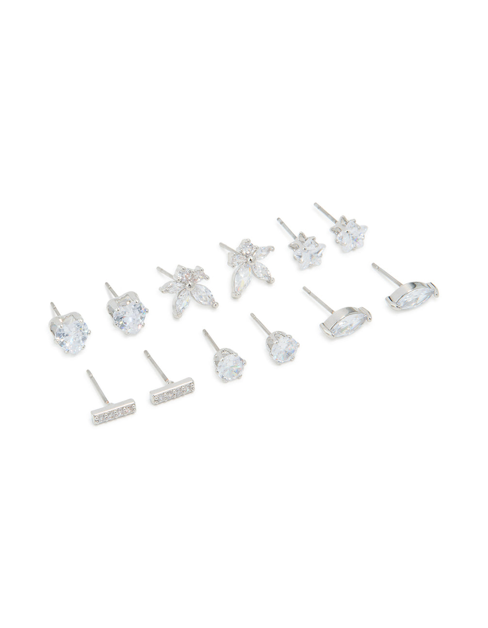 Silver Cubic Zirconia Heart & Flower Stud Earrings 6-Pack