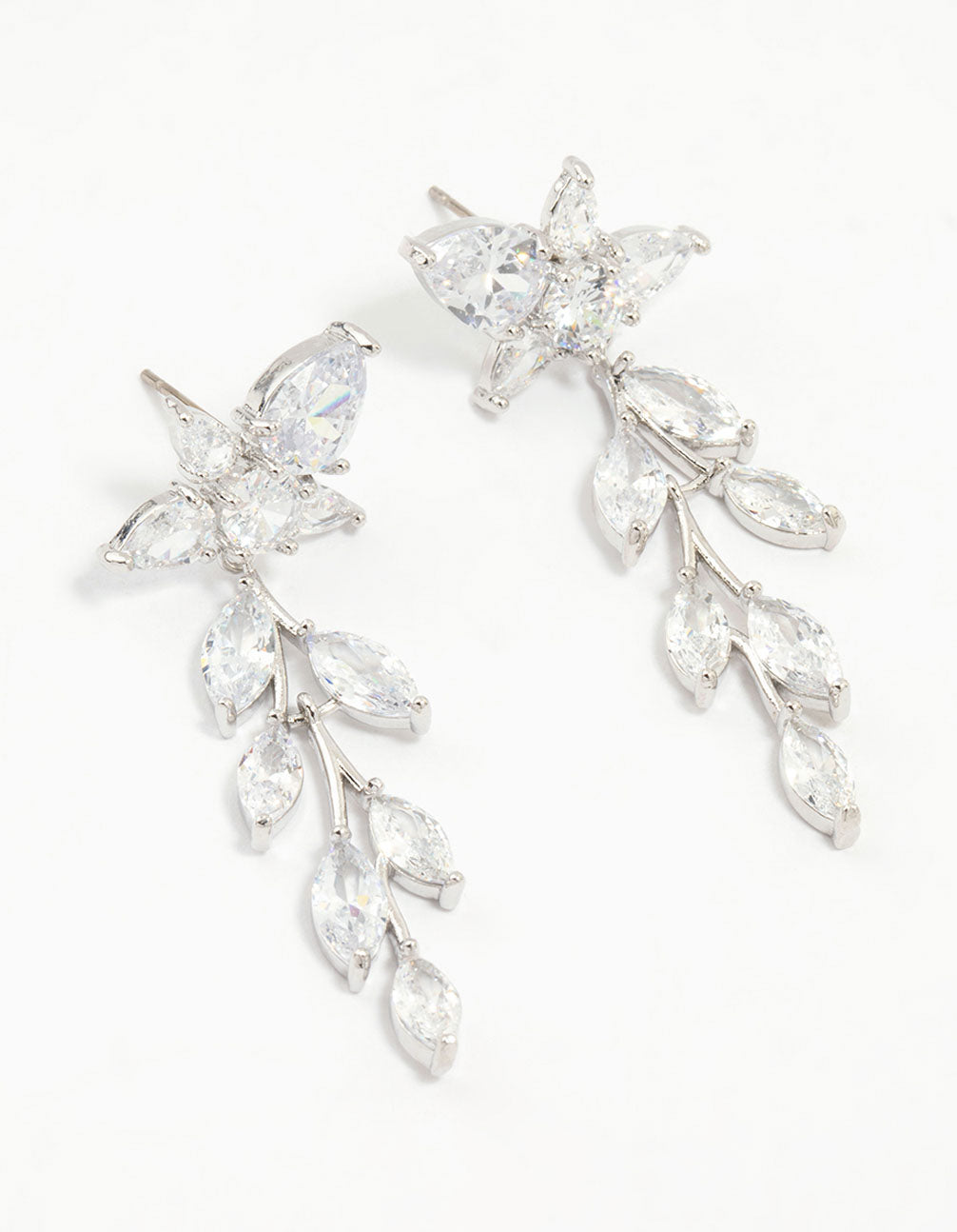 Silver Cubic Zirconia Leaf Flower Drop Earrings