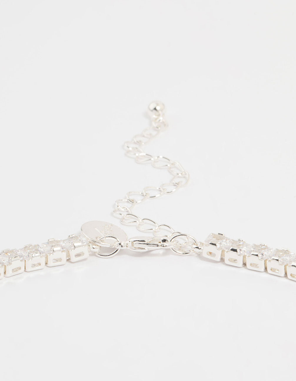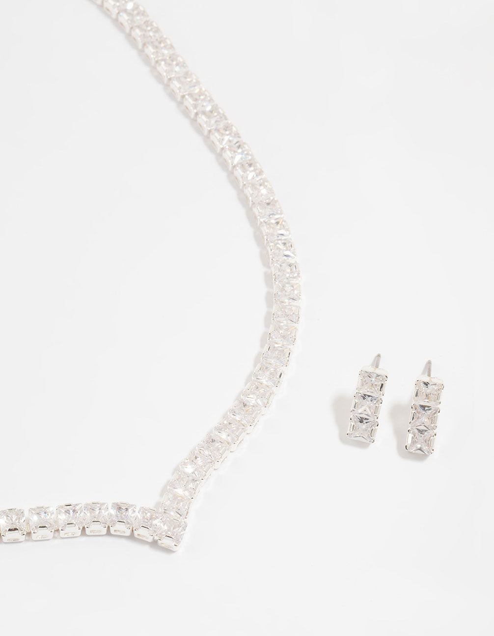 This chic v shaped necklace and matching earrings feature square-cut cubic zirconia stones that shimmer beautifully. Perfect for any occasion, add a touch of elegance and sparkle to your look!