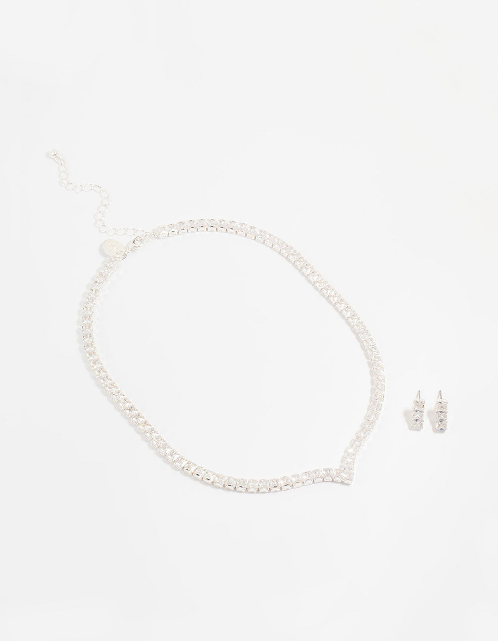 Silver Cubic Zirconia Thick V Necklace & Earrings Set