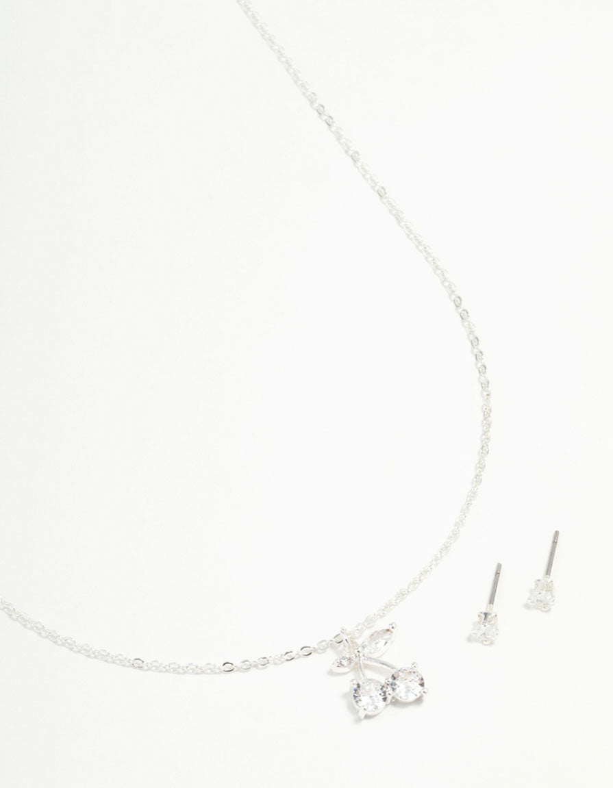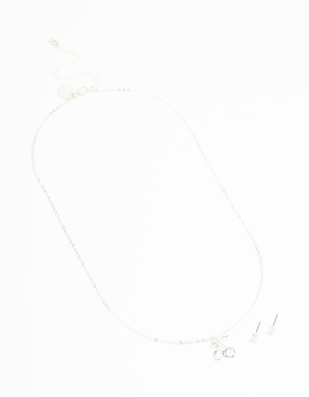 Silver Diamante Cherry Necklace & Stud Earrings Set