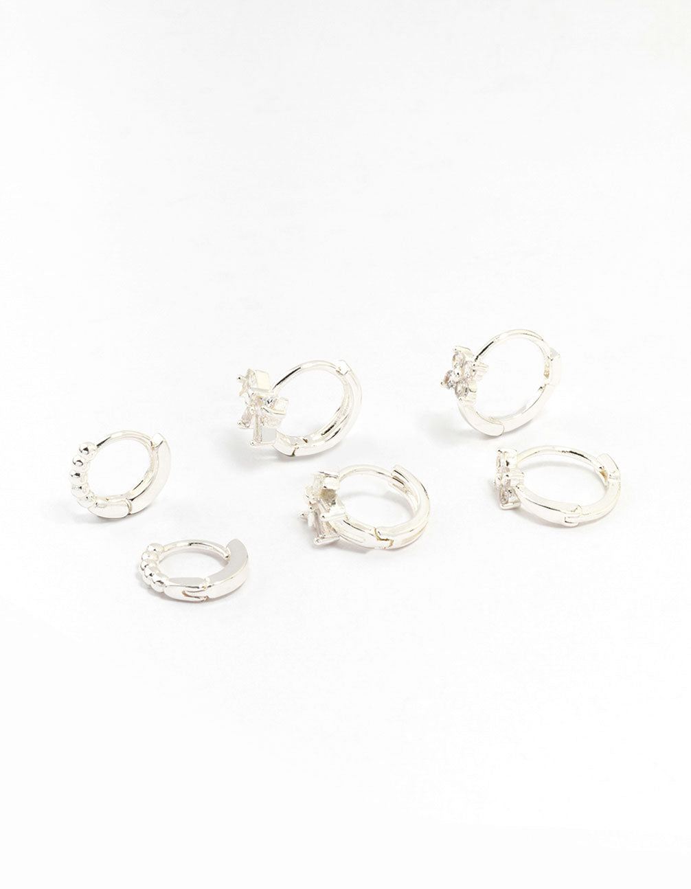 Add flirty charm to your collection with this stunning silver mixed bow earrings set. It includes shimmering coquette-inspired bow motif earrings, along with flower motif and diamante-encrusted stone earrings.
