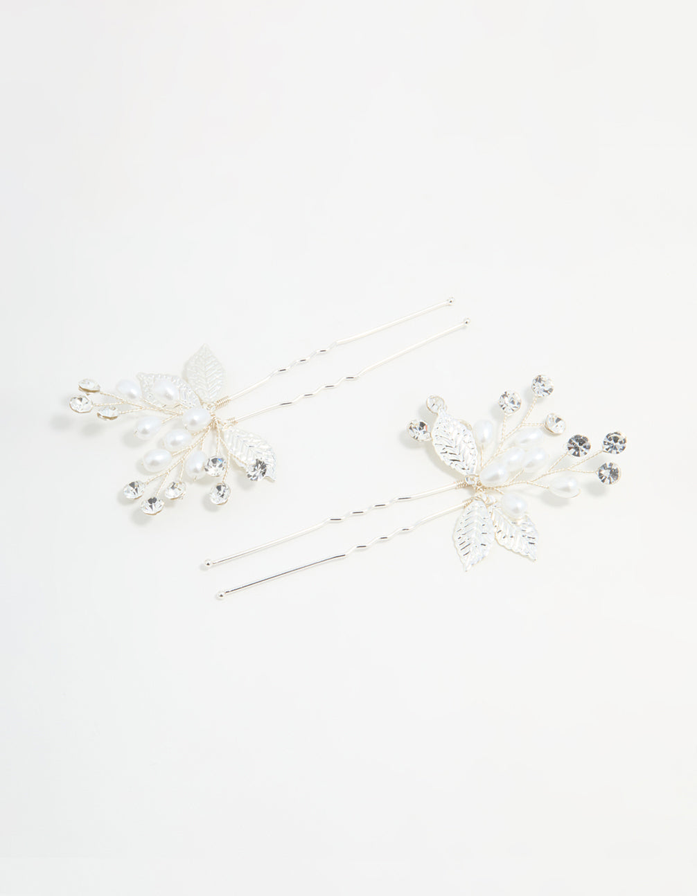 Silver Leaf Pearl & Diamante Bobby Pins 2-Pack