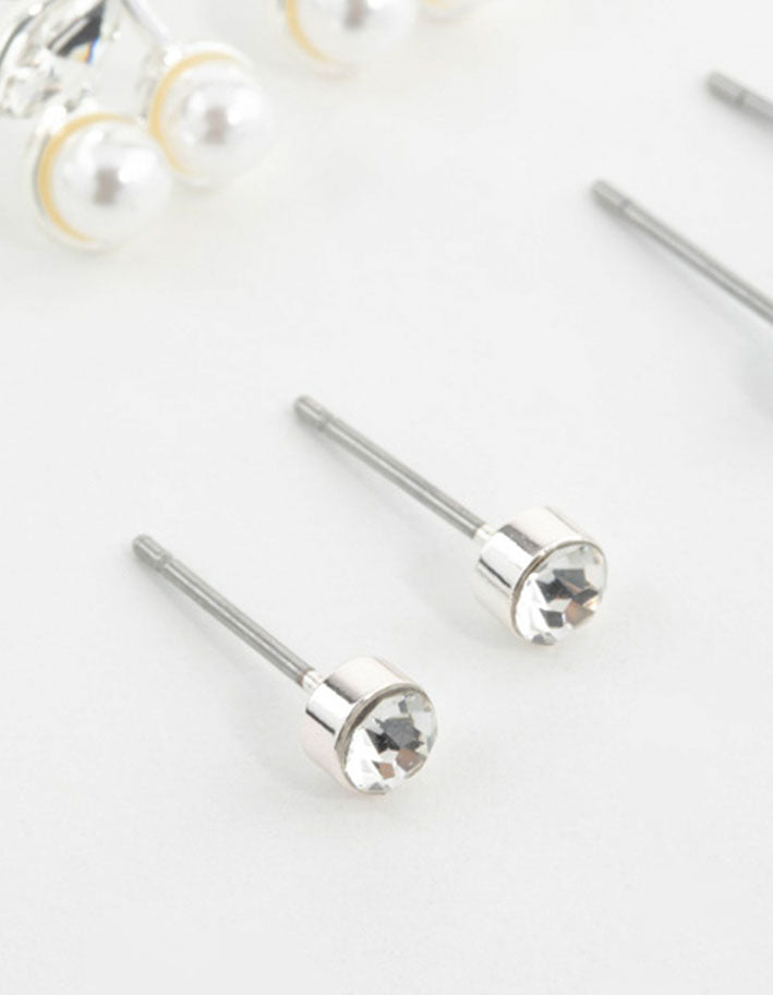 Add stunning silver style with this earring trio! Featuring silver diamante studs, pearl cherry studs, and classic pearl studs, it's perfect for any look.