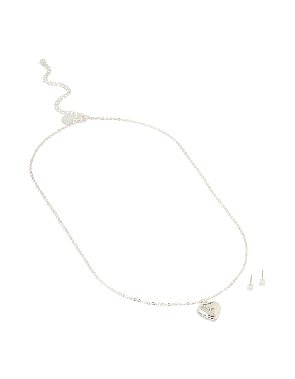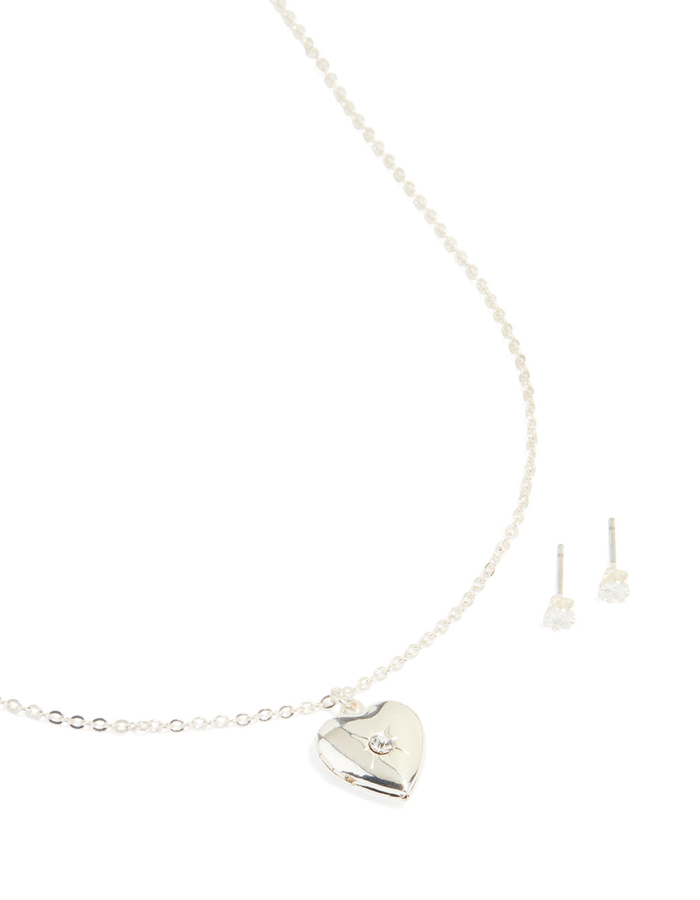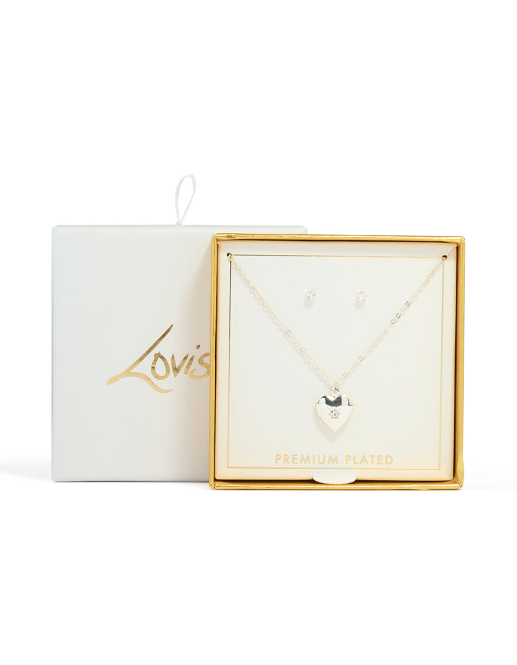 Silver Plated Cubic Zirconia Centre Heart Pendant Necklace & Earrings Set