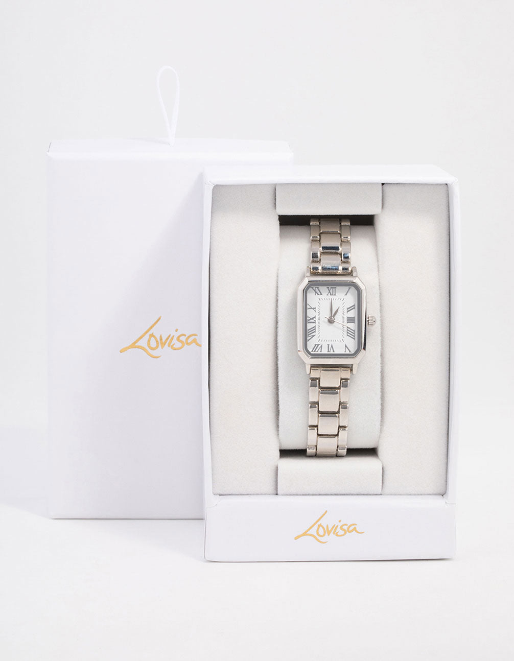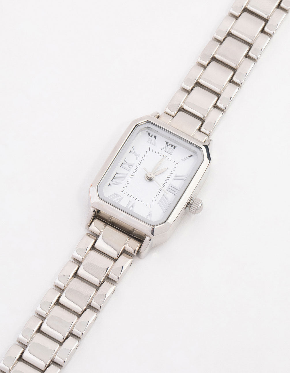 Get ready to rock classic chic with this sleek timepiece! Featuring a silver-toned metal base, a rectangle watch face, and elegant Roman numerals, this watch is the perfect accessory for keeping your schedule on point and your look sharp.