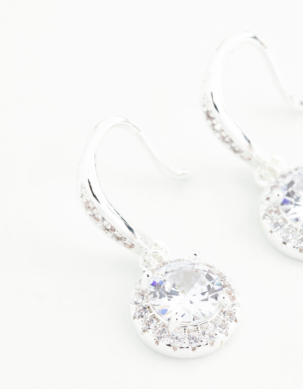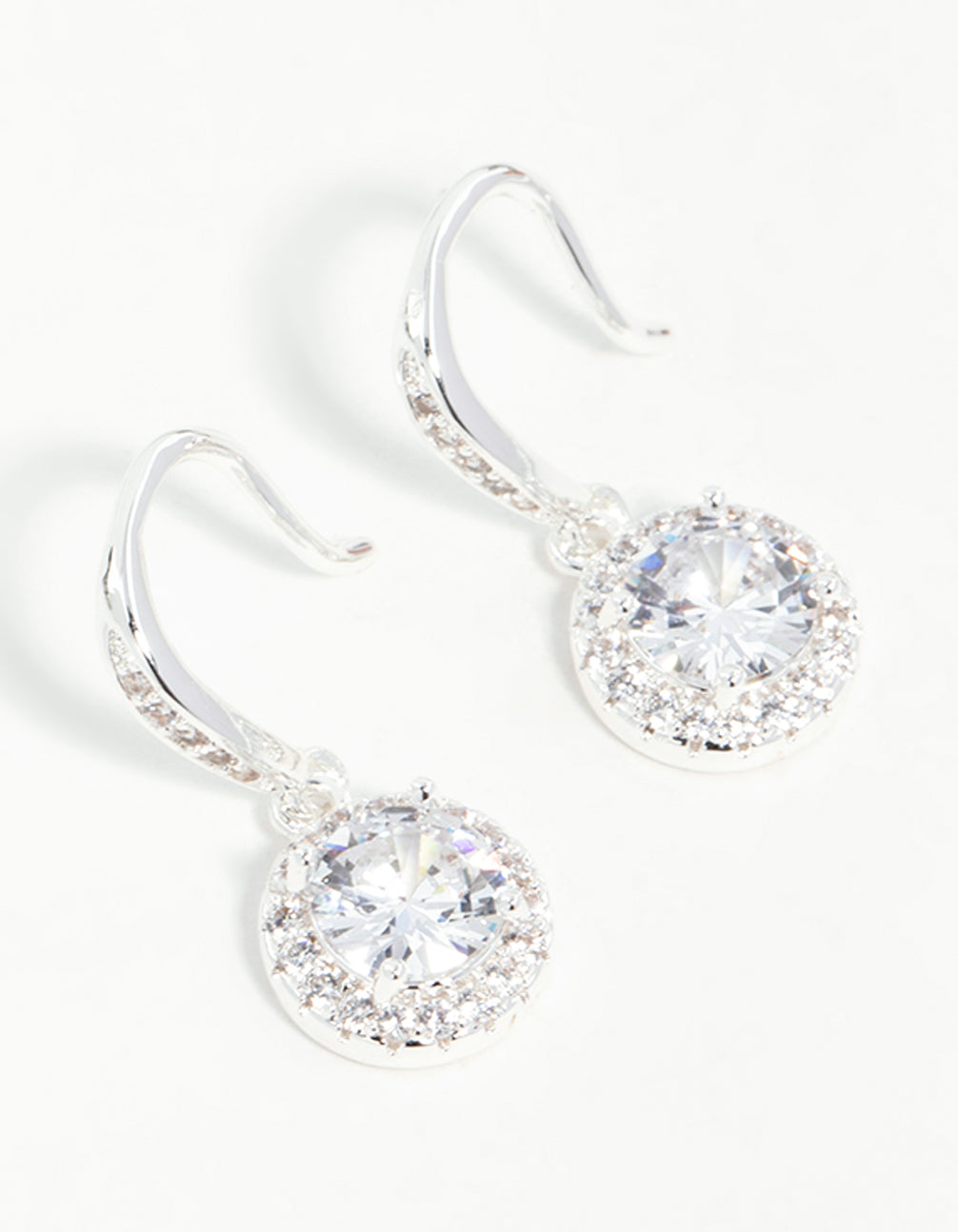 Add sparkle with these silver plated drop earrings. These stunning drop earrings feature a classic round halo cubic zirconia crystal design, perfect for wearing on your special day.