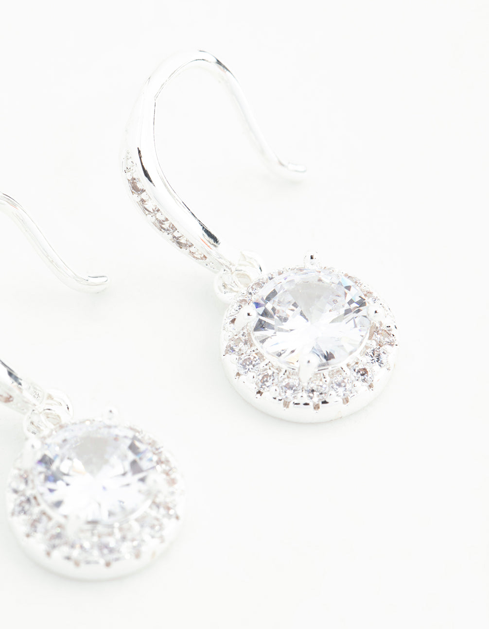 Silver Plated Round Halo Cubic Zirconia Drop Earrings