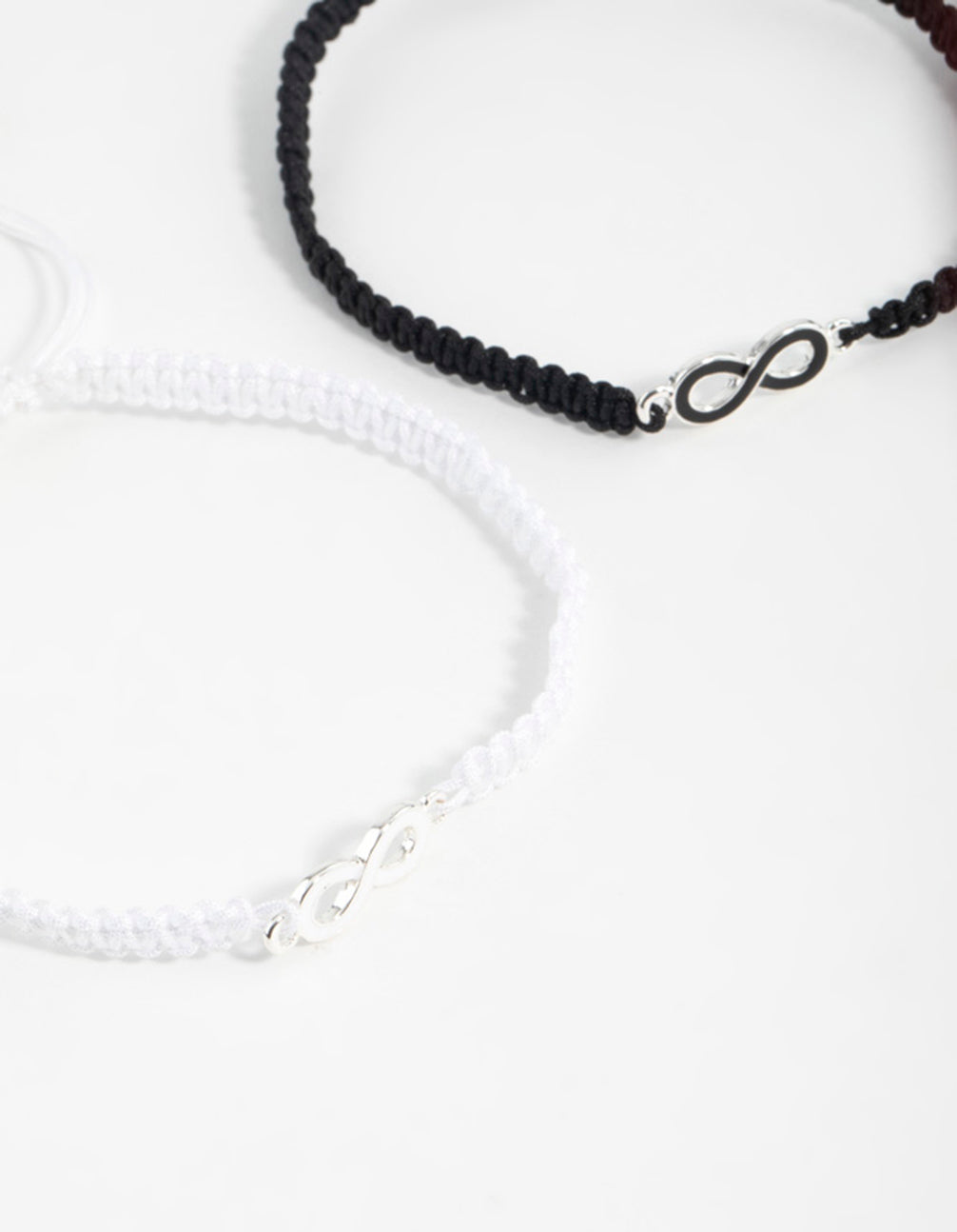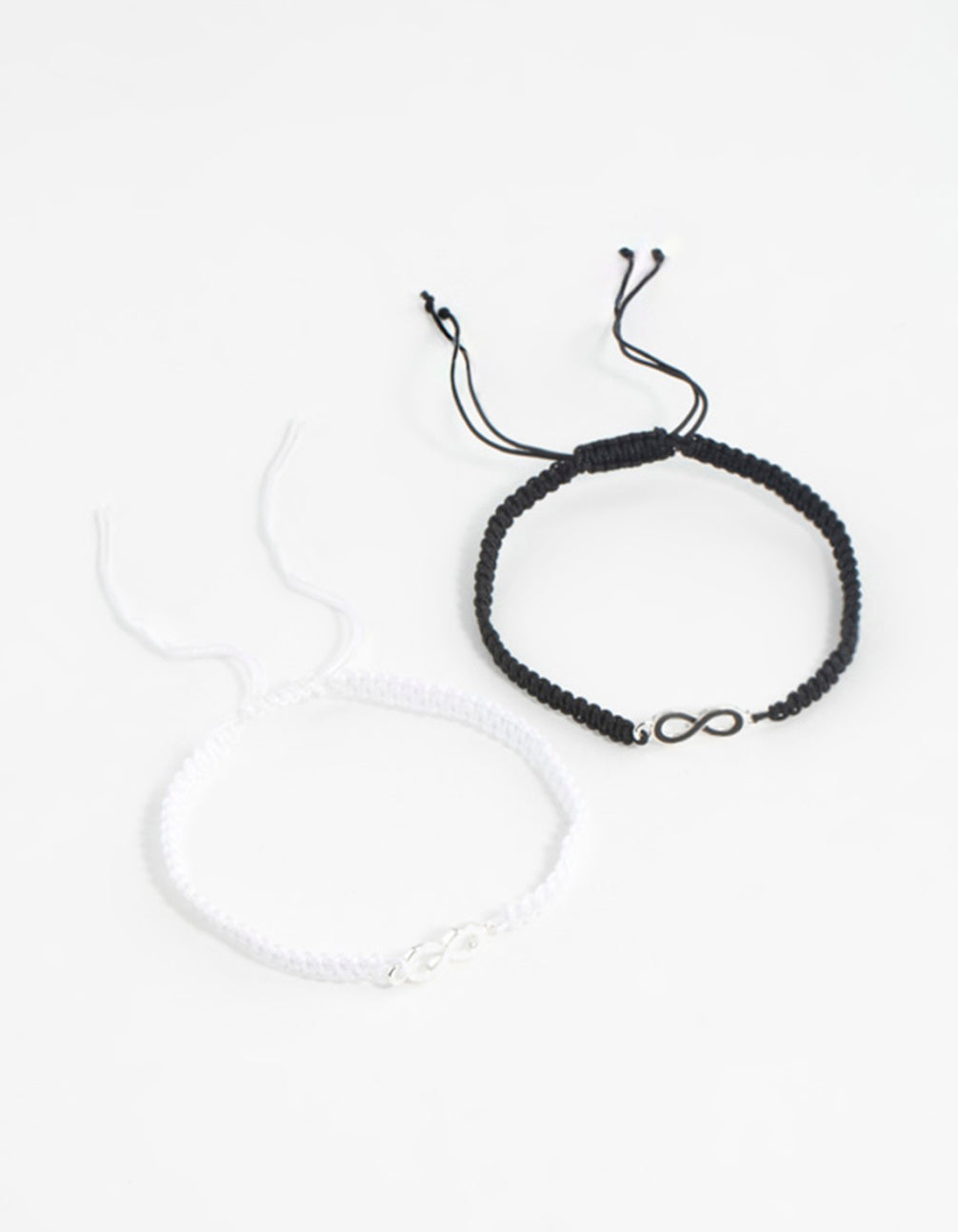 Show them you care with this fabulous bracelet pack! Featuring black and white tie bracelets with infinity symbols, it's perfect for expressing your forever love.