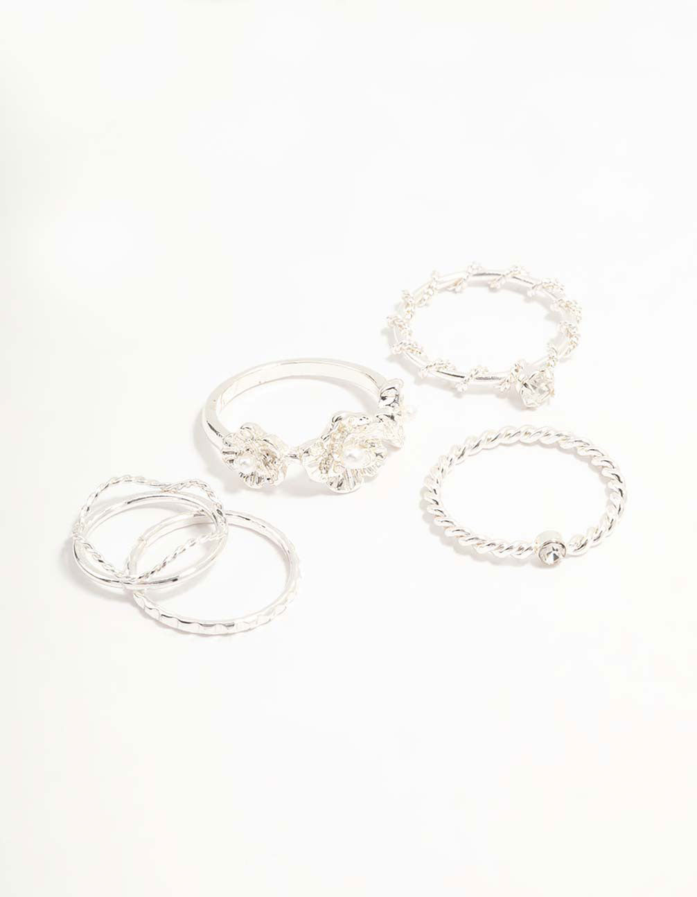 Silver Twisted, Sleek & Diamante Flower Style Rings 5-Pack