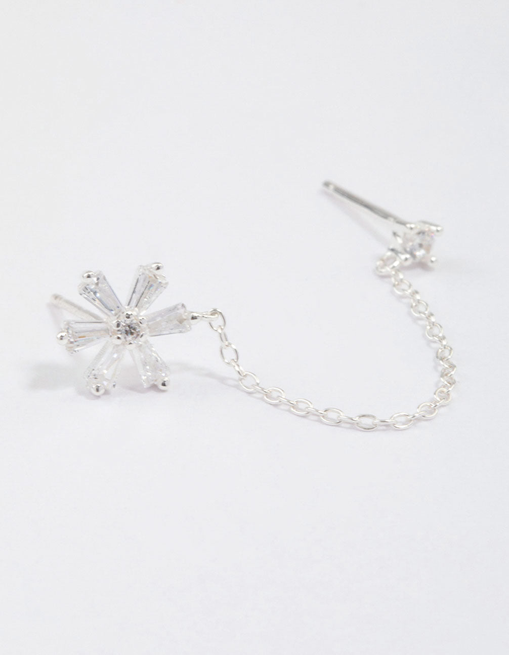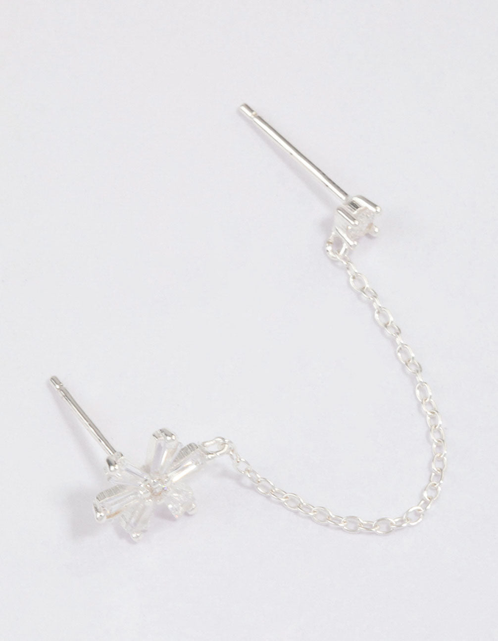 Sterling Silver Baguette Flower Chain Stud Earrings