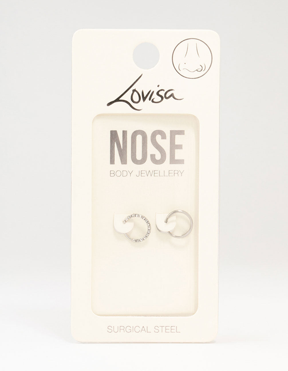 Enhance your style with this set of two surgical steel nose rings: one with cubic zirconia and the other featuring a spiral design, perfect for adding flair to your look. Ideal for those with healed nose piercings seeking trendy new designs.