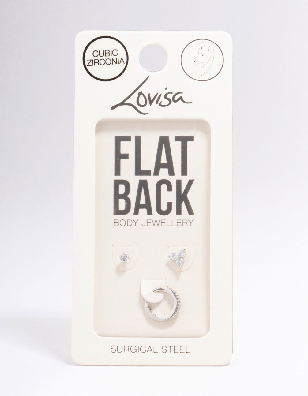 This earring pack contains a single clicker ring and two flat backs, each encrusted with cubic zirconia crystals for a hint of sparkle. Style them together for a cohesive finish to your ear stack!