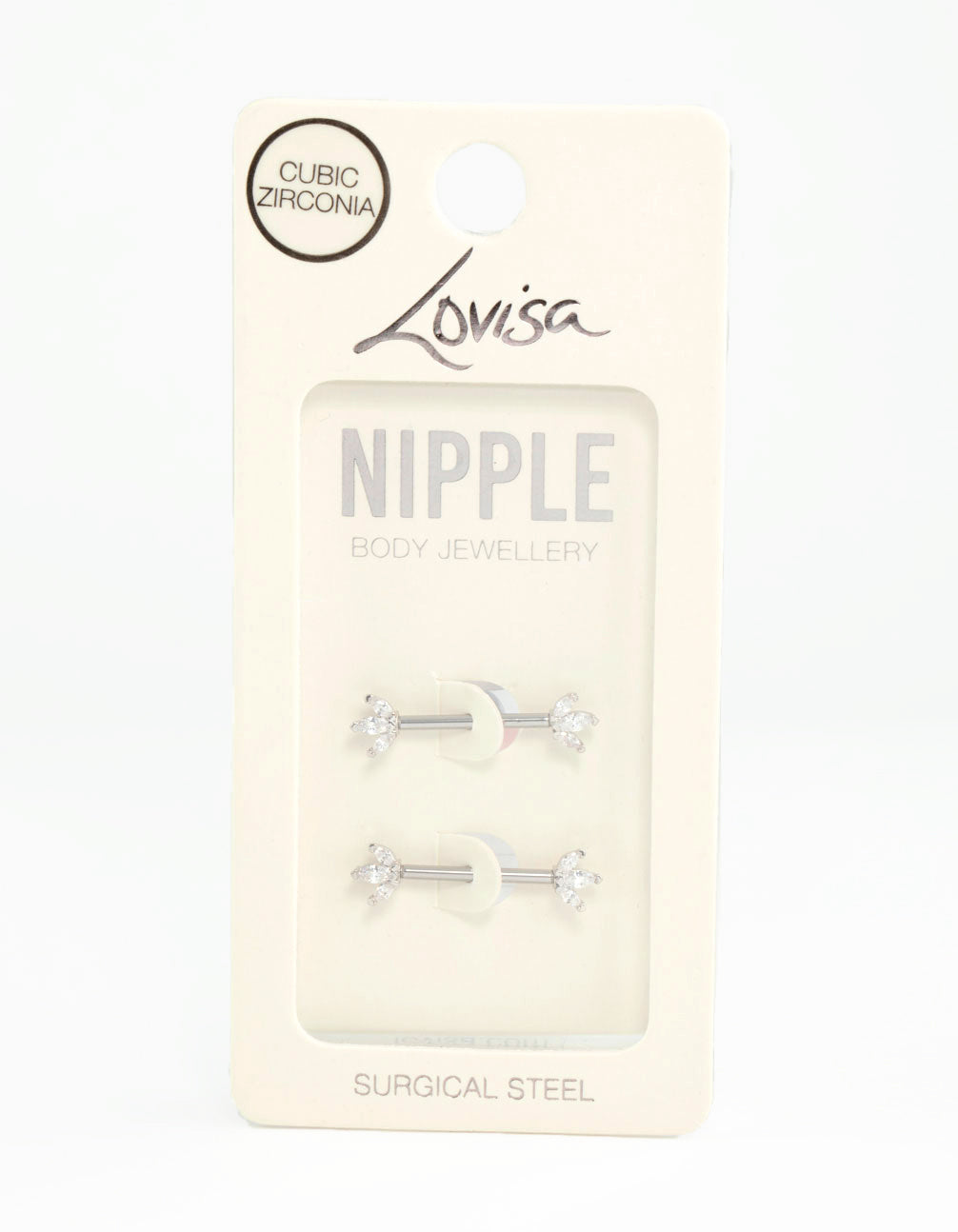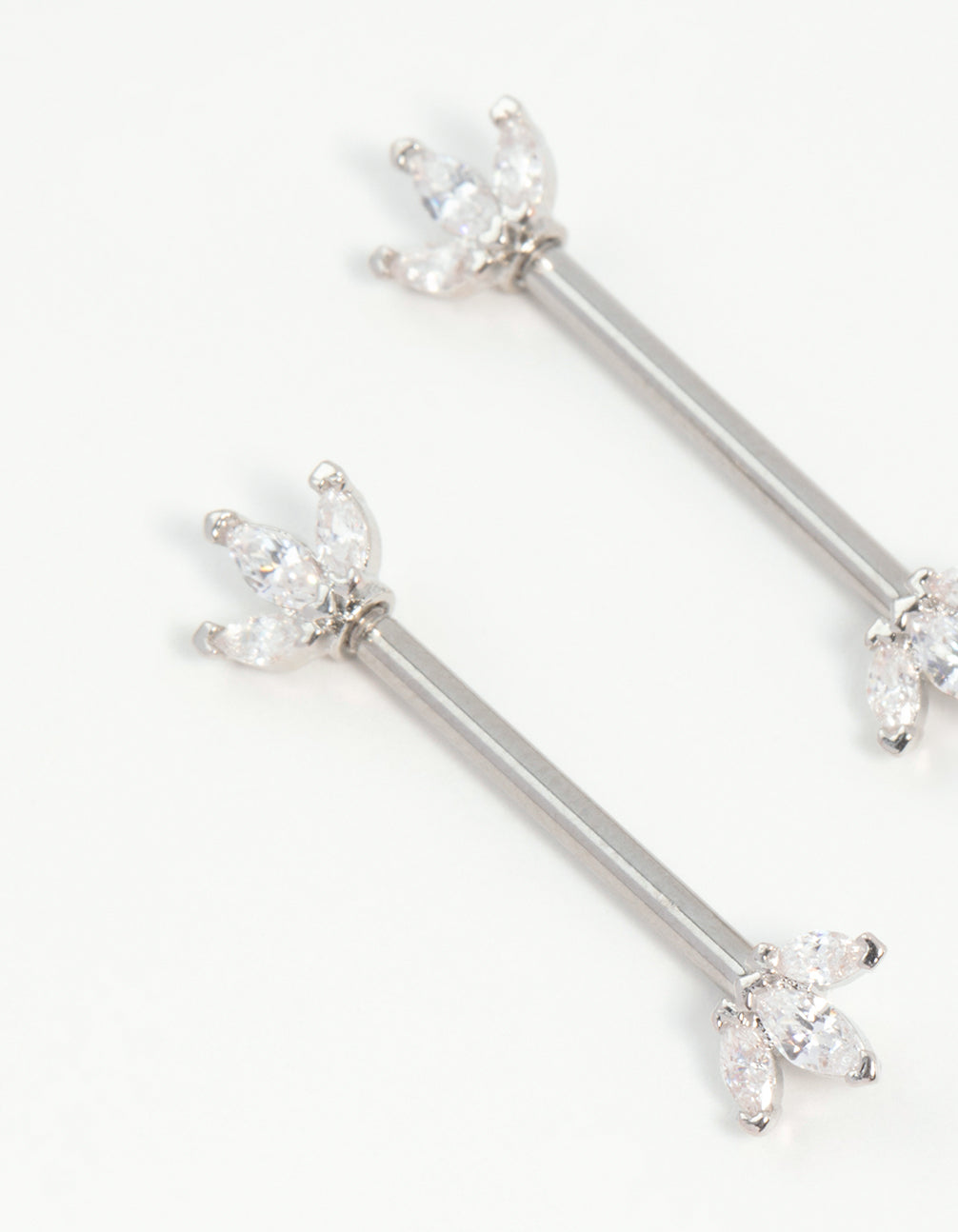 This stylish set includes two surgical steel nipple bars, each featuring a fan-shaped cluster of dazzling cubic zirconia crystals. Crafted from surgical steel, these nipple piercings are both durable and hypoallergenic.