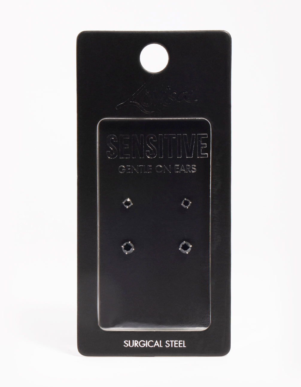 Be edgy yet elegant with this set of two surgical steel stud earring pairs . The graduating black cubic zirconia stones create a striking effect, while the hypoallergenic material ensures all-day comfort for even the most sensitive ears.