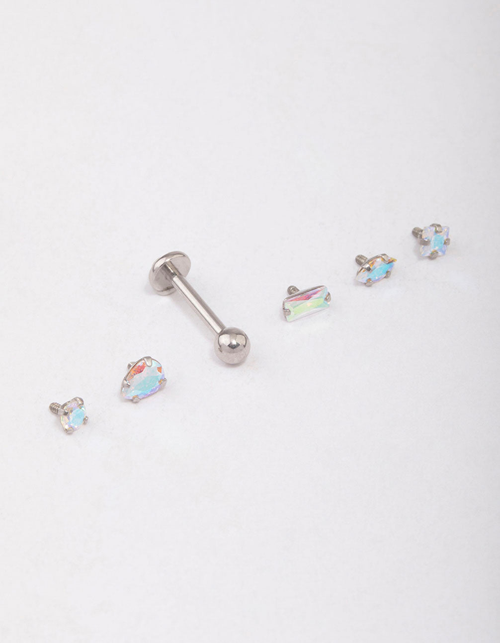 This piercing pack contains one flat back with five unique, cubic zirconia attachments. Perfect for mixing up your stack!
