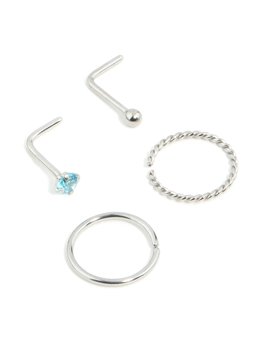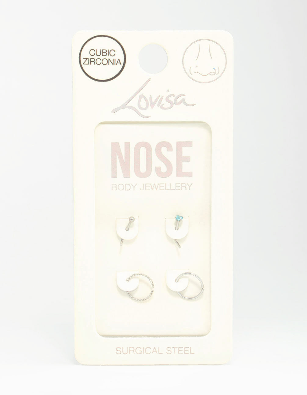 Surgical Steel Twisted Nose Rings & Cubic Zirconia Nose Stud 4-Pack