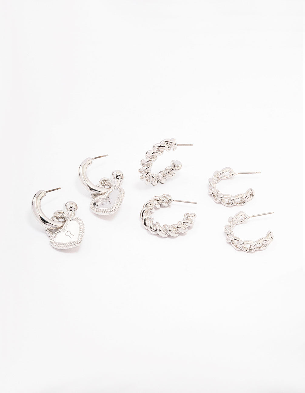 Discover must-have jewellery pieces from the Lovisa Silver Essentials Collection, designed with trending motifs and silhouettes. This charming silver toned earring set features three hoop styles; one pair of heart hoop earrings, one pair of twisted hoops and one pair of chain link style hoops.