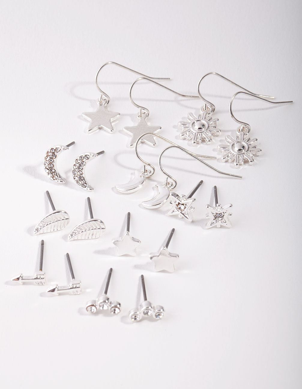 Can't decide on just one? You don't have to! This style features a variety of earrings so you can mix and match to suit your mood. This 9-pack includes diamante and silver-toned moon, star and leaf styles.