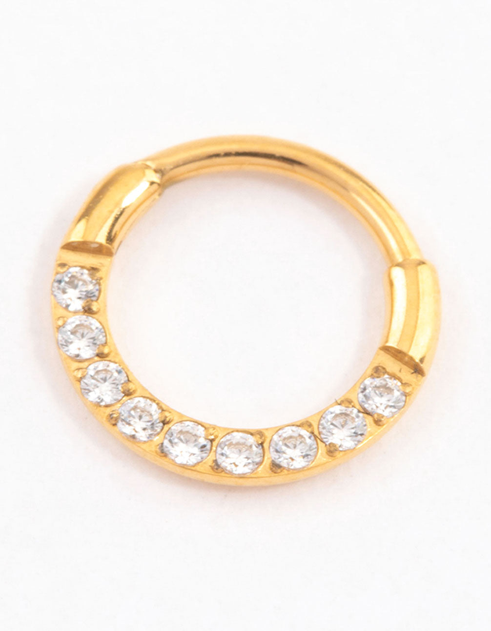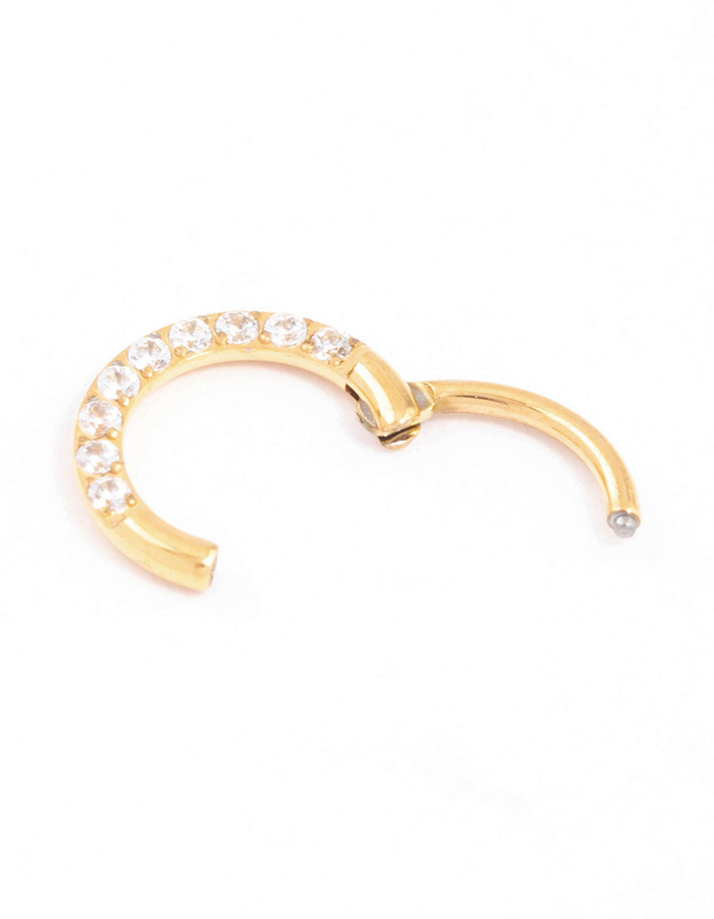 This Gold Plated Titanium Cubic Zirconia Clicker Ring is a simple and timeless ring that can be styled as a nose ring or ear piercing.