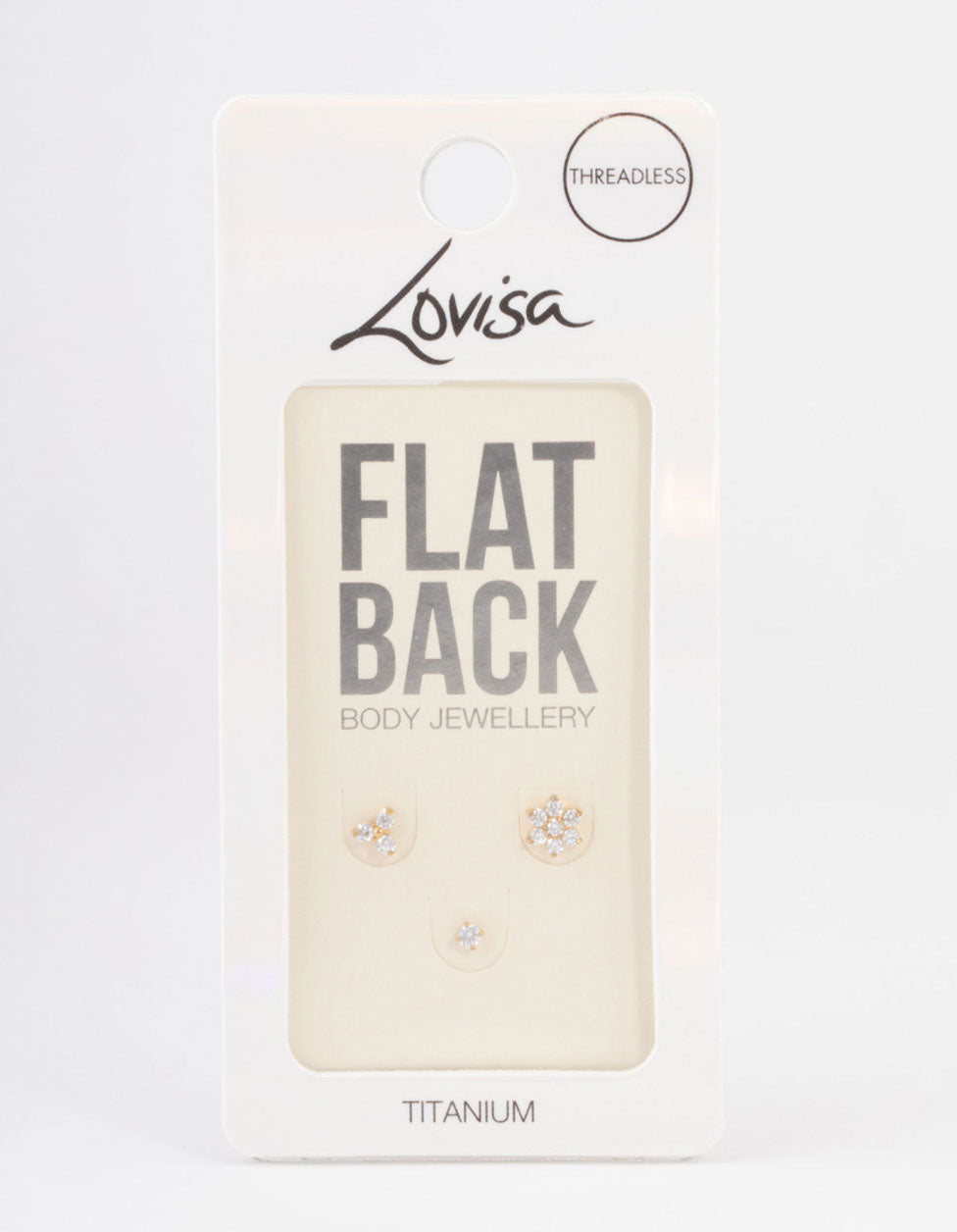 Gold Plated Titanium Cubic Zirconia Flower Threadless Flat Back Studs Pack