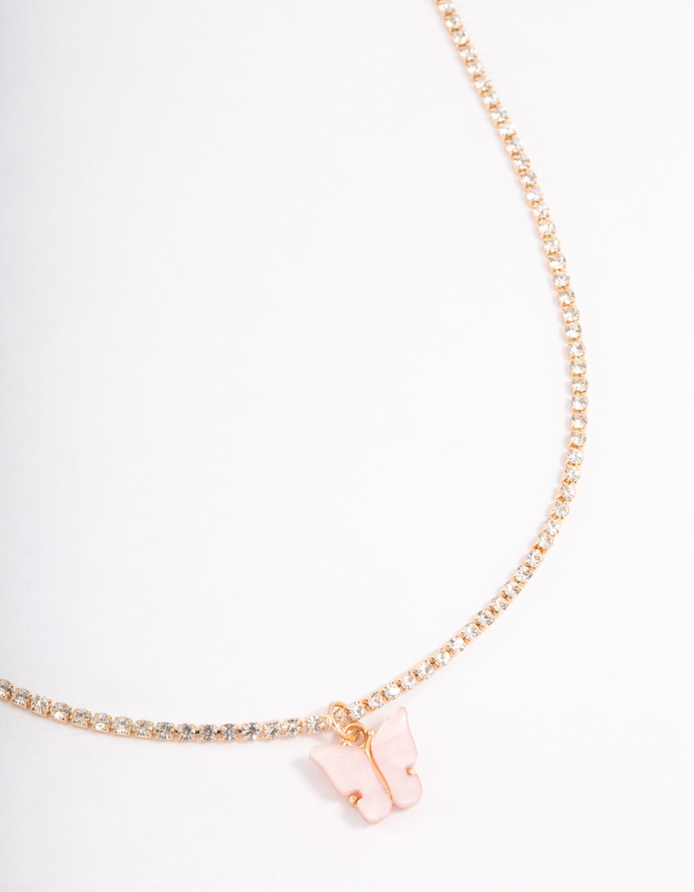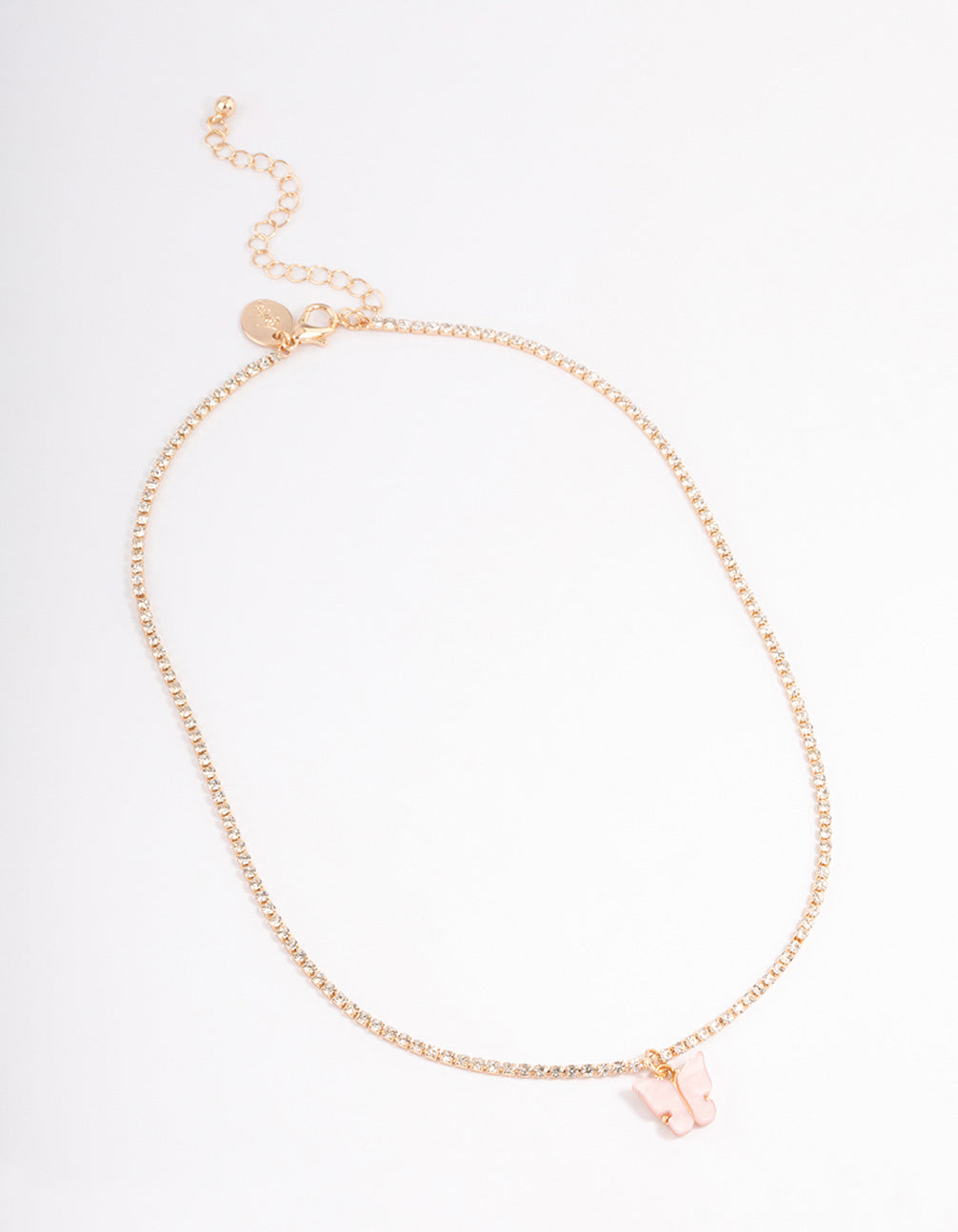 - This pendant necklace features a gold-toned, cupchain chain and pink butterfly pendant for added detail.