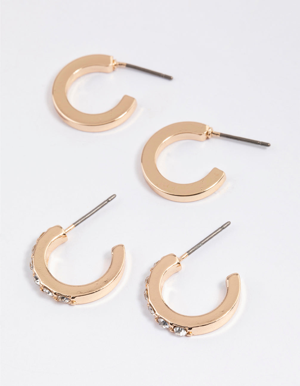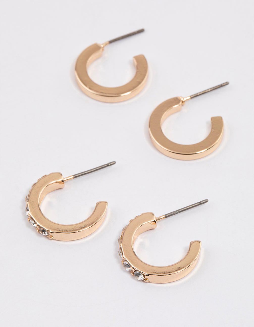 - This earring two pack contains two individual sets of diamante embellished and plain hoop earrings, crafted with a gold setting.