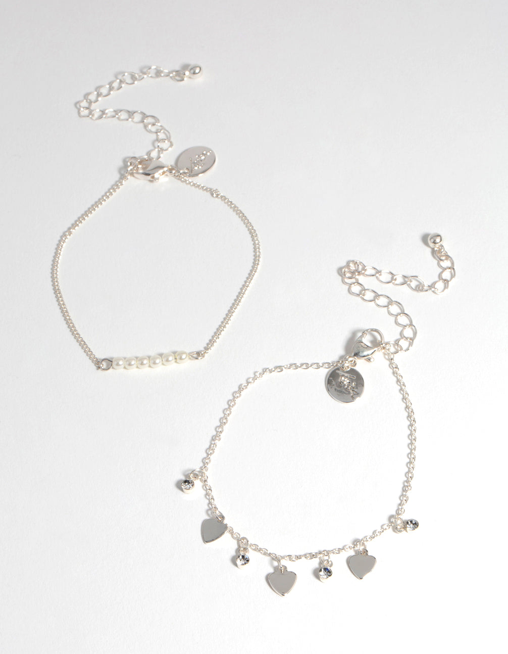 Every wardrobe needs versatile chain jewellery to elevate daily ensembles. This delicate chain bracelet set features two silver-toned bracelets, one with a faux pearl design and the other with dangling heart charms and diamantes. Wear them with absolutely anything!