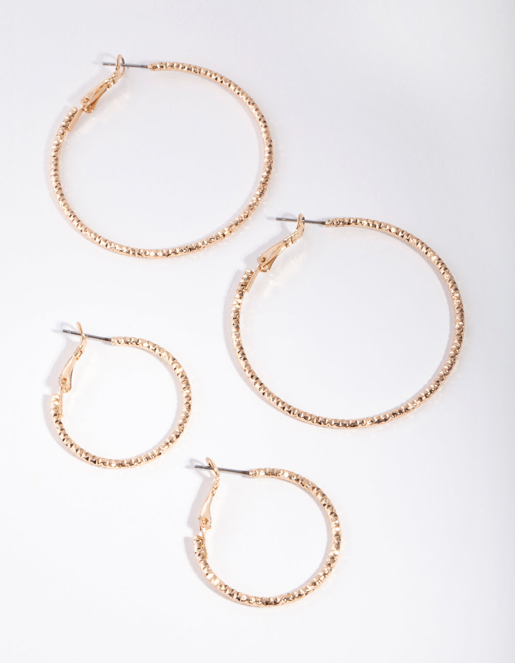 Hoops are an outfit staple that are perfect for elevating any ensemble. This pack includes two gold-toned hoops which have a diamond-cut design for extra sparkle. Wear them with any outfit!